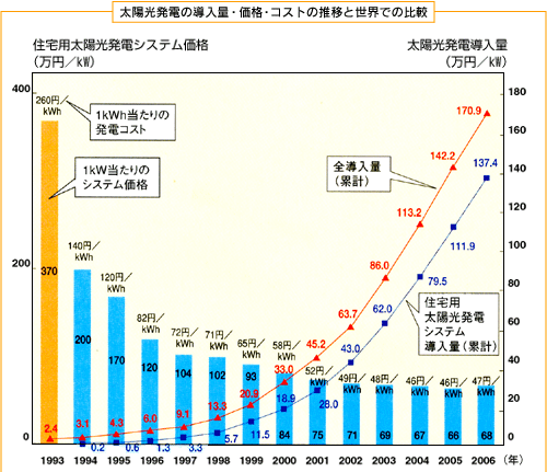 しかし、太陽電池の価格が下がると、太陽光発電の普及が大きく進みます。技術開発や大量生産によって太陽電池の価格は年々下がってきており、今後、住宅用や工場・商業ビル・公共施設などに太陽光発電はますます広がっていくと考えられます。